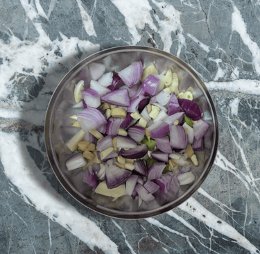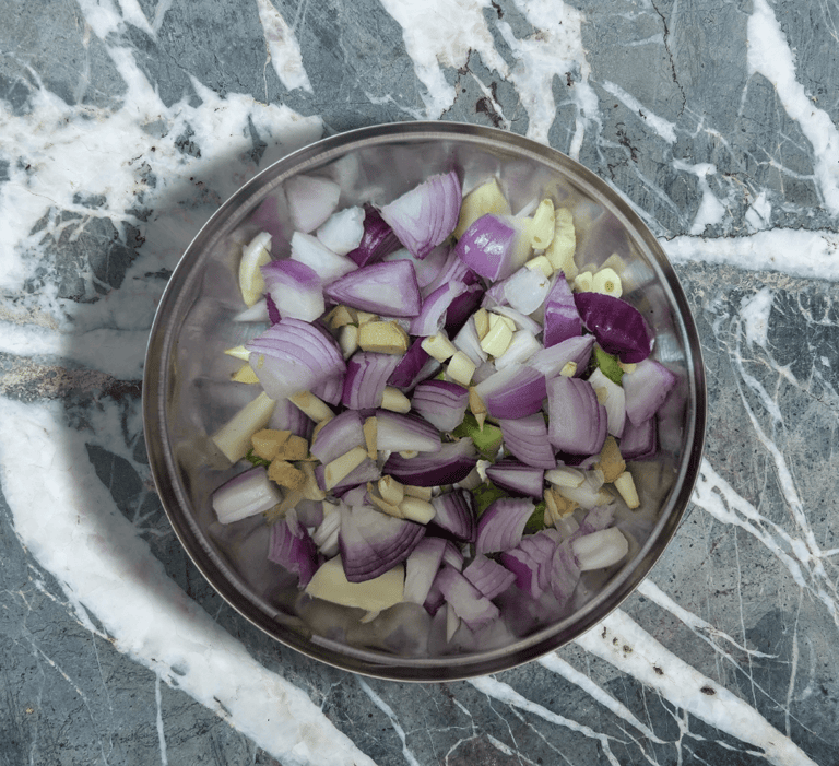 ਪਿਆਜ਼, ਅਦਰਕ ਅਤੇ ਲਸਣ ਨੂੰ ਬਰੀਕ ਕੱਟ ਲਵੋ।/ Finely chop the onion, ginger, and garlic.