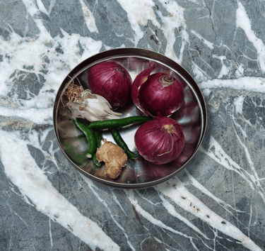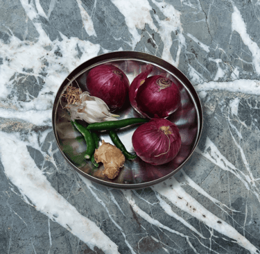 3) ਇਸ ਵਿੱਚ ਪਿਆਜ਼, ਅਦਰਕ ਅਤੇ ਲਸਣ ਪਾਓ। ਕਰਛੀ ਨਾਲ ਹਿਲਾਉਂਦੇ ਰਹੋ ਅਤੇ ਸੁਨਹਿਰੀ ਹੋਣ ਤੱਕ ਚੰਗੀ ਤਰ੍ਹਾਂ ਭੁੰਨ ਲਵੋ।/ Add the onion, ginger, and garlic. Sauté well while stirring continuously until lightly golden.