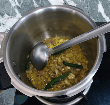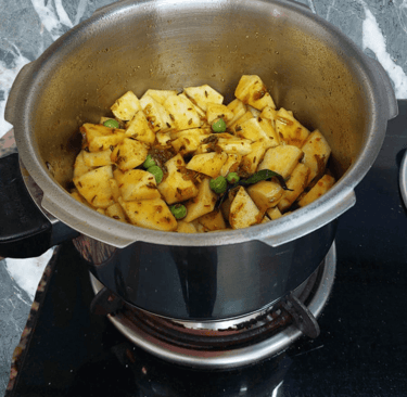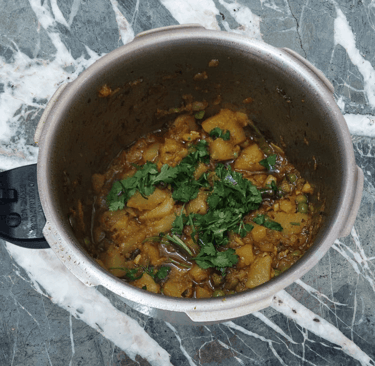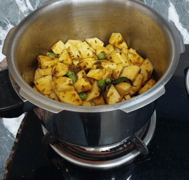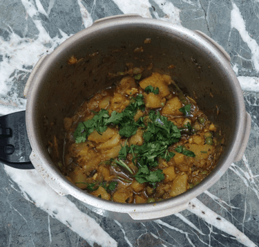 ਜੇ ਸੁੱਕੀ ਸਬਜ਼ੀ ਪਸੰਦ ਹੋਵੇ, ਤਾਂ ਪਾਣੀ ਘੱਟ ਪਾਓ ਅਤੇ ਸੀਟੀਆਂ ਦੀ ਗਿਣਤੀ ਇੱਕ ਰੱਖੋ।/ f you prefer a drier vegetable, add less water and cook with only one whistle.