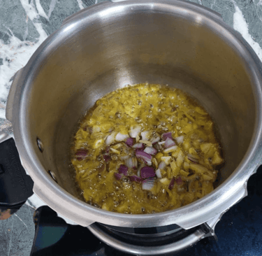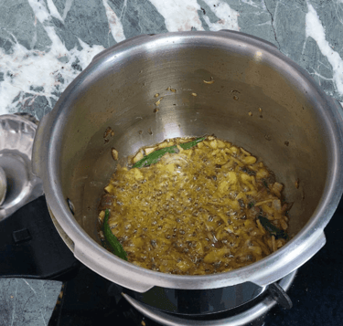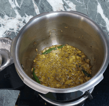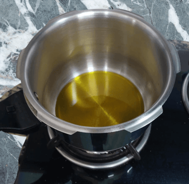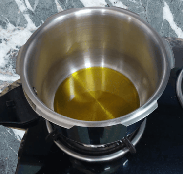 2) ਹੁਣ ਗੈਸ ‘ਤੇ ਕੁਕਰ ਰੱਖੋ। ਜਦੋਂ ਕੁਕਰ ਗਰਮ ਹੋ ਜਾਵੇ, ਉਸ ਵਿੱਚ ਤੇਲ ਪਾਓ। ਤੇਲ ਗਰਮ ਹੋਣ ‘ਤੇ ਥੋੜ੍ਹੀ ਰਾਈ ਅਤੇ ਜੀਰਾ ਪਾ ਕੇ ਤੜਕਣ ਦਿਓ।/ Now place the cooker on the gas stove. Once it heats up, add oil. When the oil is hot, add mustard seeds and cumin seeds and let them crackle.
